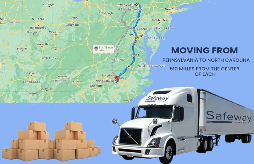 The road distance between Pennsylvania and North Carolina is under 500 miles, traveling south on I-85 S. The distance is just one of the major factors which are including when long distance movers prepare a price quote for the move. The size of the move is another major component to determine what the cost will be. Moving from Pennsylvania to North Carolina crosses state lines, so federal regulations apply.