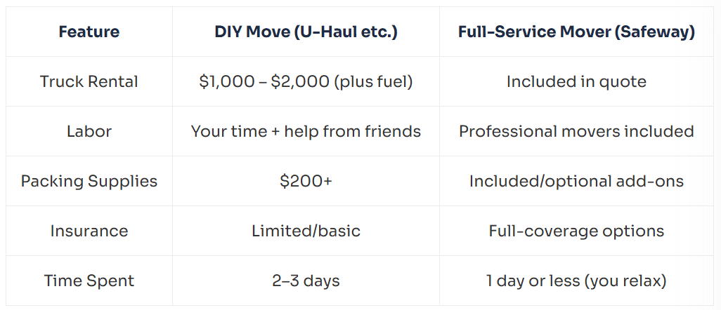 At first glance, renting a truck and doing everything yourself might seem cost-effective. However, full-service movers like Safeway Moving provide value that can offset your investment through time savings, reduced physical risk, and insurance coverage.